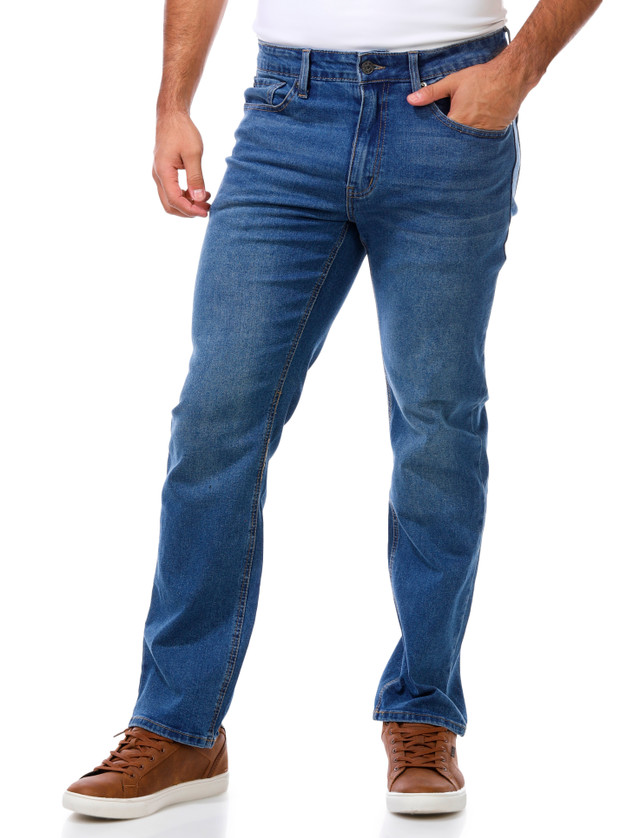 Enjoy all day comfort with the Mens Relaxed Fit Straight Leg Denim Jeans, featuring a straight leg and relaxed fit with extra room at the seat and thigh. A touch of stretch ensures ease of movement, while the classic 5-pocket style makes them versatile for weekends, work, or casual nights out. Pair with tees, shirts, or layered tops for a dependable wardrobe staple. Fabrication is 70% cotton 28% polyester 2% spandex.