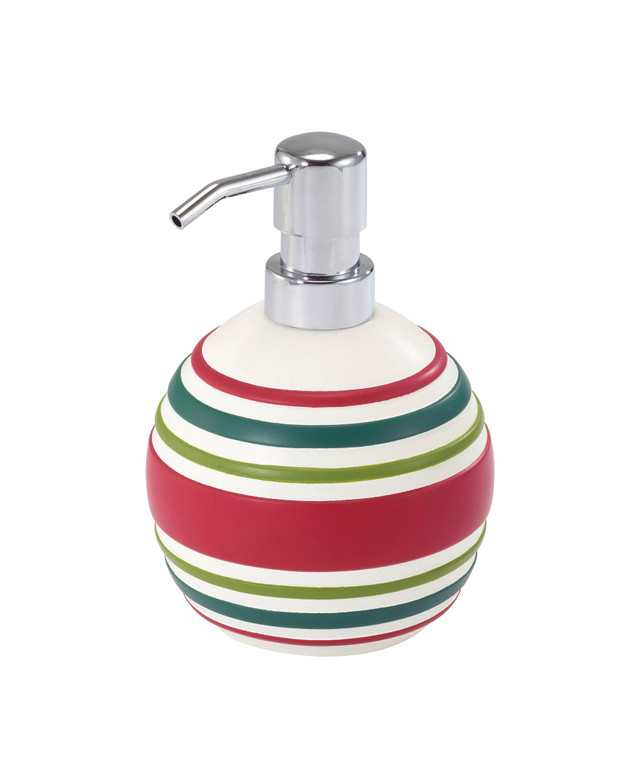 The Izod Ornament Lotion, Soap and Sanitizer Dispenser is a round shape with a large red stripe around its middle with smaller red and green stripes top and bottom. Made of durable, hand-painted resin for easy care and long life. Adds a colorful holiday feel to any bathroom or kitchen. Measures 4.30 x 4.30 x 7.00.