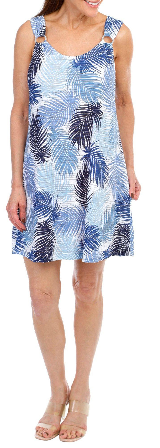 Embrace tropical vibes with our Womens Palm Print Cover Up Dress. Crafted from a blend of polyester and spandex, this dress offers a comfortable and stretchy fit. It features a crew neckline and a sleeveless design, perfect for warm weather. The ring accents on the shoulders add a unique and stylish touch. Ideal for beach days or poolside lounging, this cover-up dress is a must-have for your summer wardrobe!