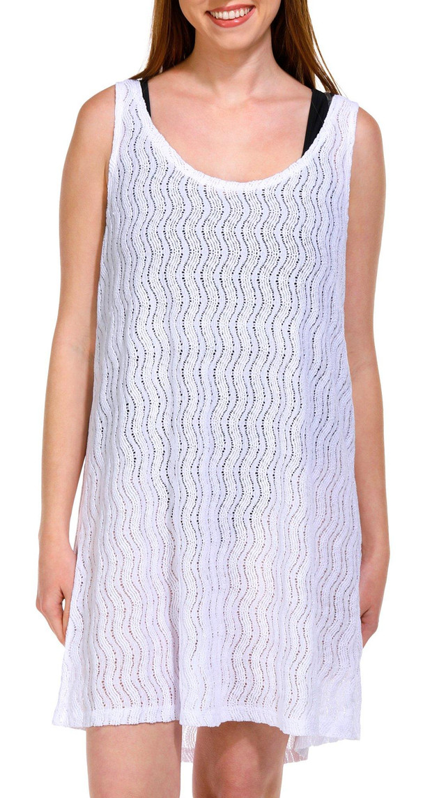 Embrace beachside elegance with this Calypso Sleeveless Tank Dress Coverup. Crafted from open knit fabric, this coverup offers a breezy and lightweight feel, perfect for warm days. The embroidered pattern adds a touch of bohemian flair, while the short length provides a chic look. Ideal for layering over your favorite swimwear, this coverup combines style and comfort effortlessly. Fabrication is 95% polyester, 5% spandex.