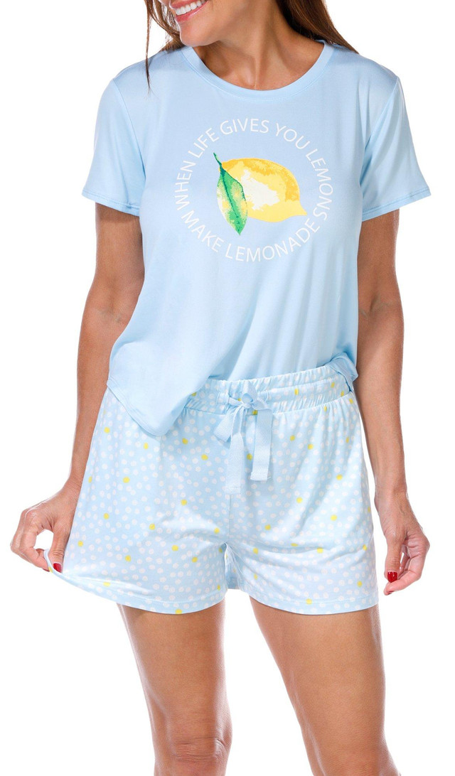 Brighten your bedtime with our Women's 3 Pc Lemon Print Sleepwear Set. Featuring a fun graphic top and two pairs of coordinating shorts, this cheerful set offers playful style and comfy versatility. Fabrication is 95% polyester, 5% spandex