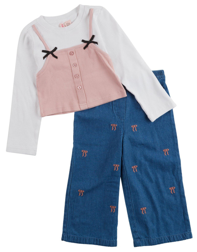 Stylish comfort for every day! This little girls' 3-piece pants set includes a long sleeve double-layer top and pull-on jeans, finished with sweet embroidered bow details. Perfect for school days or casual outings with a touch of charm. Top Fabrication 95% cotton, 5% elastane. Pants Fabrication 100% cotton