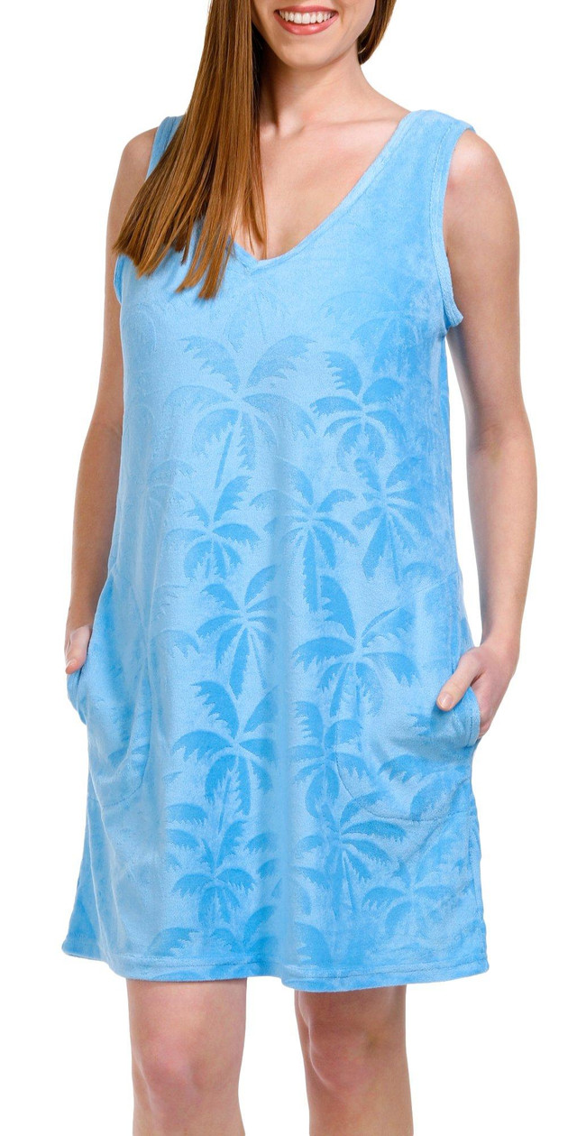 Stay cool and comfortable with our Pique Terry Sleeveless Dress. Made from absorbent micro terry fabric, this dress is perfect for warm days and beach outings. The charming palm tree pattern design adds a touch of tropical flair, making it a stylish choice for any casual occasion. Embrace the laid-back vibes and enjoy the perfect blend of comfort and style with this versatile and chic dress. Length measures approximately 36 in.