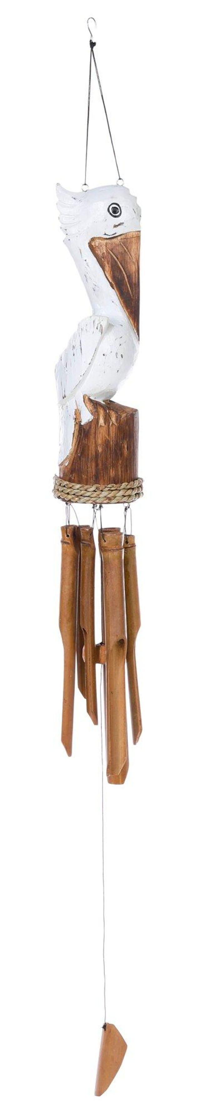Add ocean flair to your outdoor space with the 45 in Wood Pelican Bamboo Wind Chimes featuring a painted pelican design. Natural bamboo chimes create soothing tones perfect for patios or garden areas. Pelican topper measures approximately 15 in x 5 in. Hangs down 45 inches.