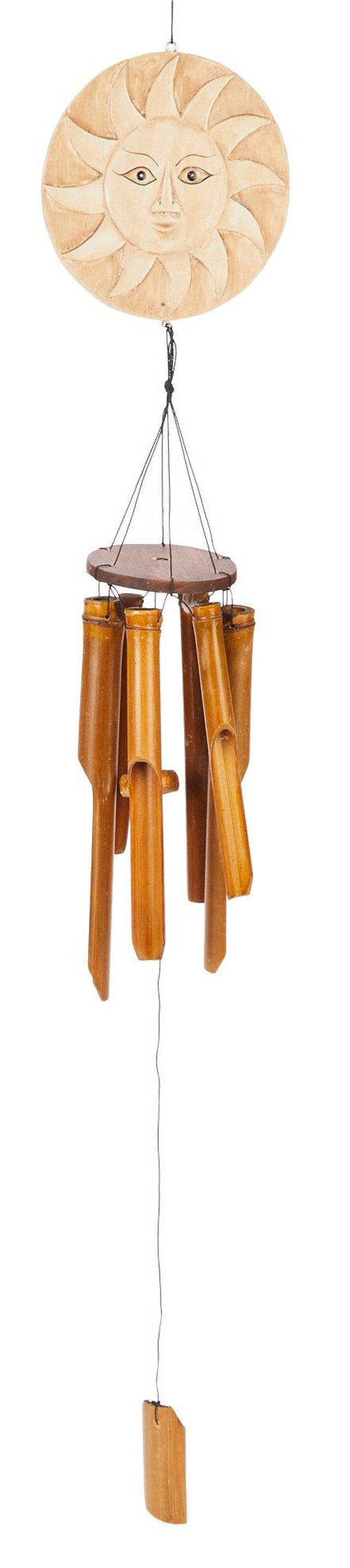 Bring a sense of serenity to your space with the 50 in Bamboo Wood Celestial Wind Chimes featuring a carved sun at the top and a circular holder supporting natural bamboo chimes. A wooden striker produces soothing tones with every breeze. Ideal for patios, porches, or garden retreats. Sun carving is 6.5 in round. Hangs down 50 inches from the top.