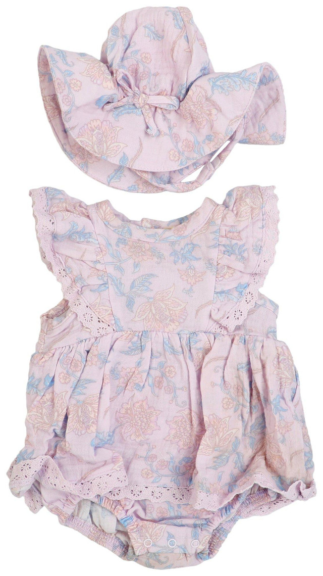 Wrap your little one in sweet charm with this 2-piece Baby Romper and Hat Set. Made from soft, 100% cotton in a delicate floral pattern, the romper features ruffled shoulders, a lace-trimmed mock skirt, and easy-snap bottoms for quick diaper changes. The matching baby bucket hat, complete with a cute bow and secure Velcro chin strap, adds a touch of sunshine-ready style. Perfect for cozy comfort and picture-perfect days. Fabrication is 100% cotton.