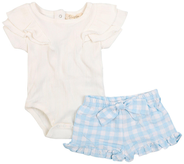 Wrap your little one in sweet charm with this 2-piece Baby Romper and Shorts Set. Made from a soft cotton/spandex blend, the romper features a solid color, ruffled shoulders, back snaps and easy-snap bottom for quick diaper changes. The shorts feature a gingham pattern and a cute bow accros the front, which adds a touch of sunshine-ready style. Perfect for cozy comfort and picture-perfect days. Fabrication is 96% cotton, 4% spandex.
