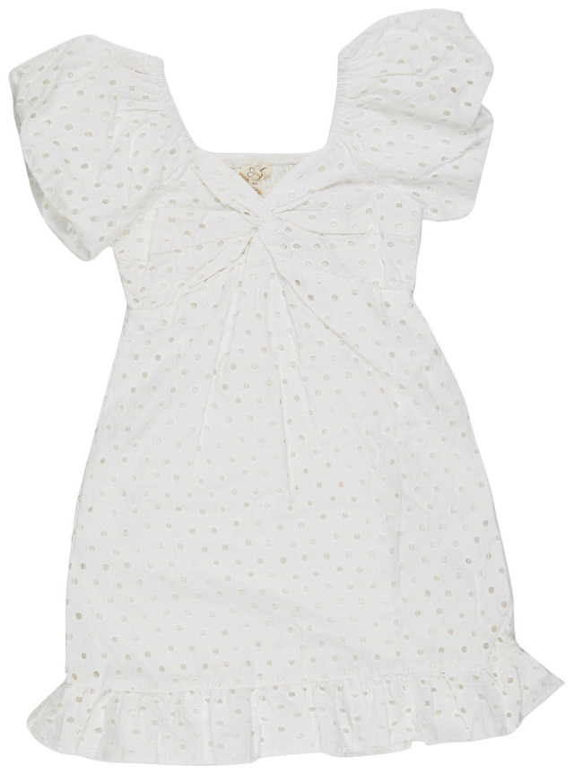This Big Girls Eyelet Twist Dress features a solid color with an all-over eyelet design, short sleeves, a twist front split neckline, and smocked back detailblending classic charm with modern style for any special occasion.