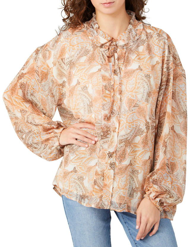 Introducing the Juniors Celeste Boho Top, crafted from 100% polyester for a lightweight and breezy feel. This stylish top features a vibrant paisley print, a tie front neckline, and long sleeves, adding a touch of bohemian flair to your wardrobe. The mesh body offers a unique and airy design, making it perfect for layering. Ideal for any casual outing, this top combines fashion and comfort seamlessly.