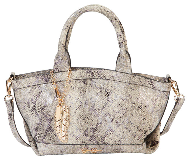 This womens satchel handbag showcases a bold snake print accented with shiny gold feather hardware for standout style. A long adjustable strap offers versatile carrying options while a zippered top keeps belongings secure. This bag is designed to elevate both casual and dressy looks with a modern edge. Measures approximately 12.5 x 7 in x 7 in, excluding handles.