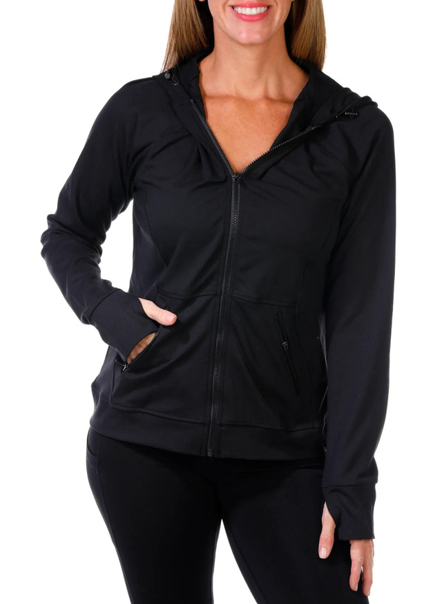 Stay active in comfort and style with this womens yoga jacket. Featuring a solid color, full front zip closure, front pockets, a hooded neckline, and stretchy material, it is perfect for workouts or casual wear. Fabrication 86% polyester, 14% spandex