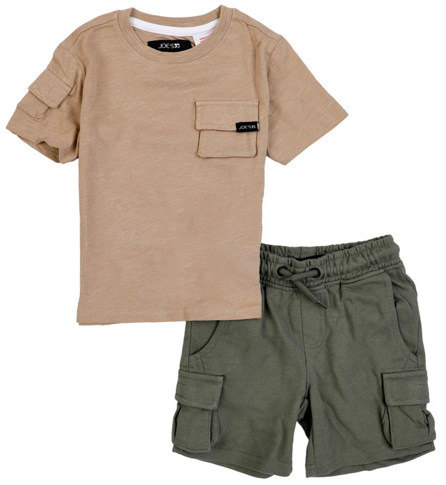 Bringing that classic summer vibe, this 2 pc shorts set features a solid tee with two pockets, which pairs perfectly with these cargo shorts, making it an easy go-to for summer playdates, BBQs, or holiday celebrations. Crafted from lightweight, breathable fabric, it keeps your little one cool and comfortable all day long. A spirited combo that's as fun as it is functional! Fabrication is: Shirt 100% cotton, Shorts 60% cotton, 40% polyester..