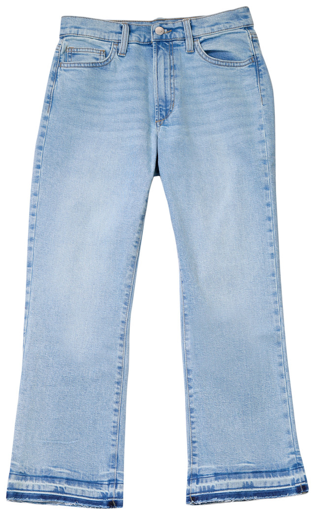 Add effortless boho style with the Womens High Rise Bootcut Released Hem Jeans. Featuring a relaxed high rise fit, cropped bootcut silhouette, and basic five pocket design, these jeans offer a small amount of stretch for comfort. The released distressed hem adds a trendy, casual touch, perfect for pairing with tees, blouses, or ankle boots. Inseam measures approximately 26 in. Fabrication is 99% cotton 1% elastane.