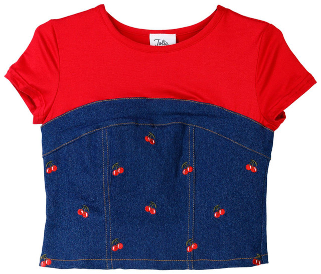 Add playful charm to her look with the Girls Denim Embroidery Crew Neck Top. Featuring a soft fabric upper and a denim bodice with embroidered cherries, it blends comfort with fun, textured detail. The crew neckline and short sleeves offer a classic fit for easy styling. Ideal for school, outings or casual wear. Machine wash cold for easy care.