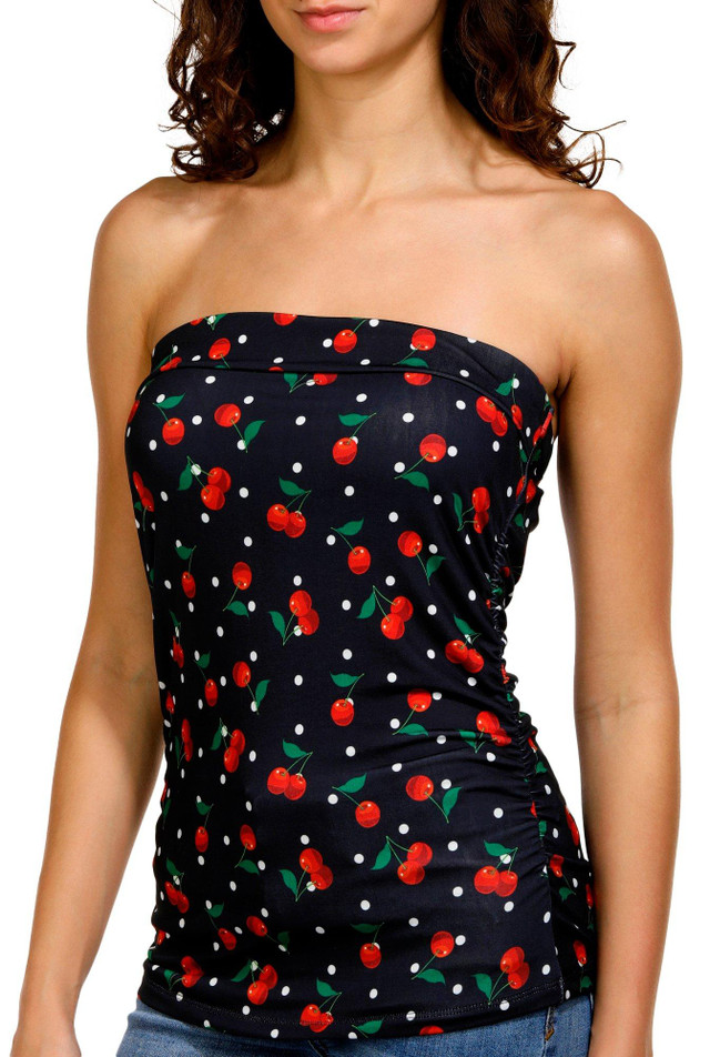 Introducing the Juniors Cherry Print Tube Top, crafted from a blend of polyester and spandex for a comfortable and stretchy fit. This cute top features an adorable cherry print and side ruching for a flattering silhouette. With a length of 17 inches, it's perfect for pairing with high-waisted jeans or skirts. Embrace playful style and comfort with this charming tube top.
