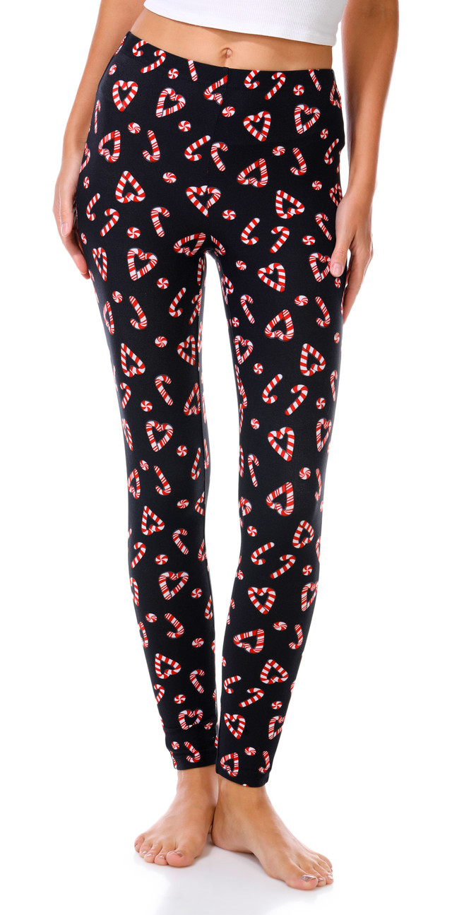 These juniors bottoms feature a fun Christmas print of candy canes. Soft and comfortable with no pockets, they bring festive cheer and cozy style to seasonal lounging or sleepwear. Fabrication is 95% polyester and 5% spandex.