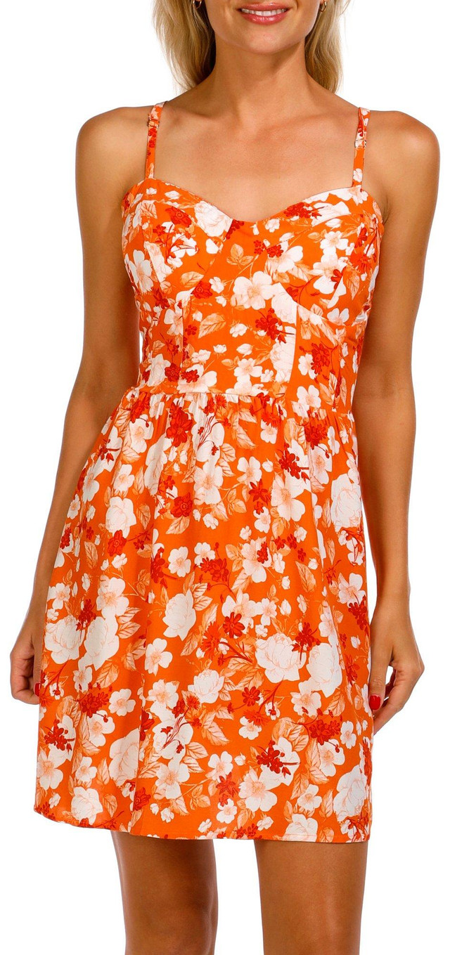 The Juniors Floral Print Mini Dress adds a splash of romantic charm with its delicate floral pattern. Featuring adjustable spaghetti straps, removable cups, a flattering v-neckline, and a 31 inch length, this dress is perfect for sunny days and warm nights. Fabrication 100% rayon