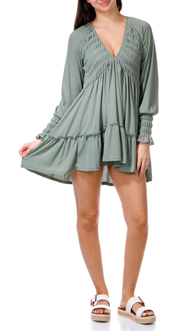 This long sleeve v-neck ruffle dress offers a sweet and simple look with its solid color design and smocked upper. Soft ruffle tiered hem adds movement while the comfortable fit flatters for everyday wear or special outings. Inseam measures approximately 30 inches. Fabrication 95% polyester, 5% spandex