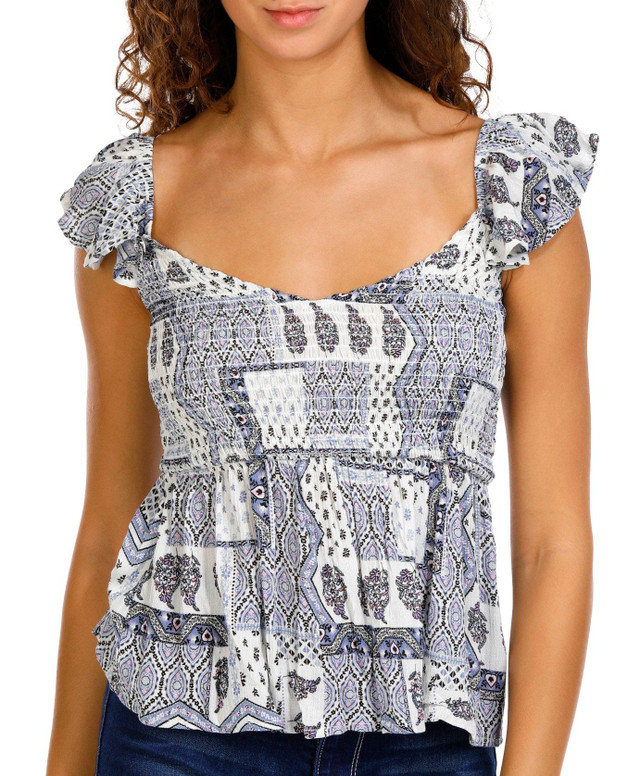 This sleeveless top features a playful print pattern with smocked and ruffled details for a flattering, feminine touch. Light and breezy, its perfect for warm days and casual outings.