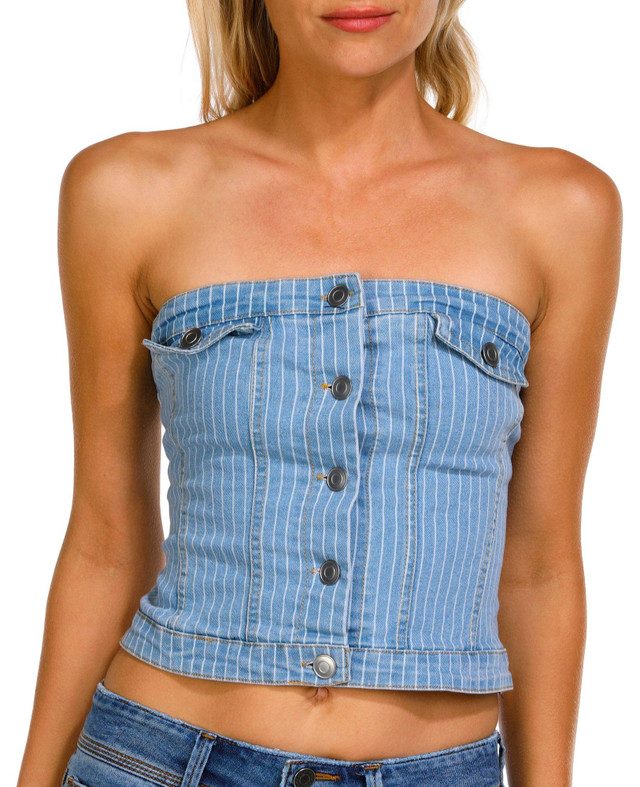 Introducing the Juniors Stripe Denim Tube Top, a stylish blend of cotton, polyester, and spandex for a comfortable and flattering fit. This top features a trendy striped pattern and a smocked back for added stretch and support. The button-down front adds a classic touch, while the faux pockets enhance its chic appeal. With an 11-inch length, this tube top is perfect for casual outings or layering. Elevate your wardrobe with this versatile and fashionable piece.