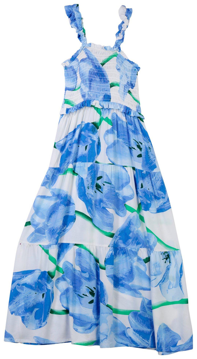 Turn heads in this Juniors Tulip Maxi Dress, featuring a stylish all-over print, smocked chest for a flattering fit, ruffle straps for a feminine touch, and a graceful 43-inch length. Fabrication 100% rayon