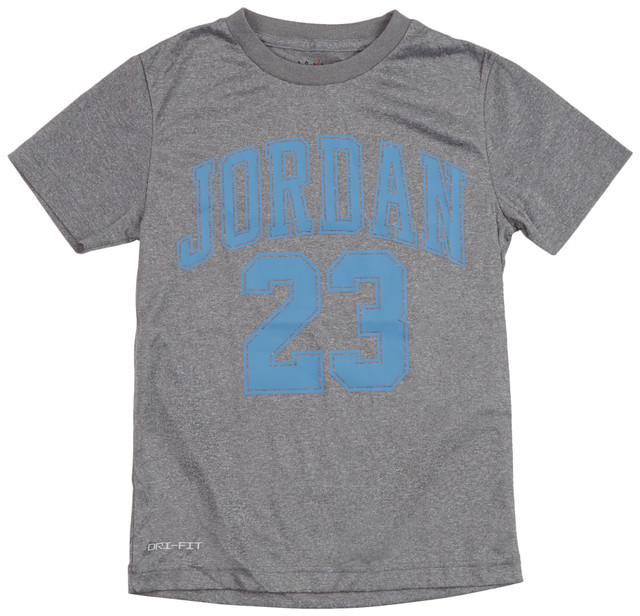 Stay cool and comfortable in the Big Boys Jordan 23 Dri-Fit T-Shirt, featuring moisture wicking Dri-Fit fabric to help keep you dry. A bold Jordan 23 graphic adds sporty style, while the crew neck and short sleeves offer classic comfort for everyday wear. Fabrication is 100% polyester. Length measures approximately 23 in.