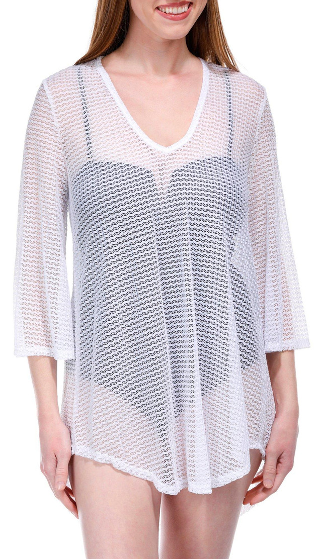 This coverup features a solid color design on soft lightweight sheer stretch fabric, long bell sleeves, a v-neckline, and relaxed styling. The top length measures approximately 30 in. Fabrication 92% nylon, 8% spandex.