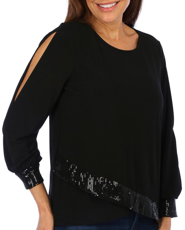 Shine bright with our Petite 3/4 Cold Shoulder Sequin Top. This stylish top features a solid color and a trendy cold shoulder design, perfect for adding a touch of flair to your outfit. The sequin trim on the sleeves adds a hint of sparkle, while the round neckline offers a classic look. Made from a blend of polyester and spandex, this top ensures a comfortable and flexible fit. Ideal for both casual and semi-formal occasions, its a chic addition to your wardrobe.