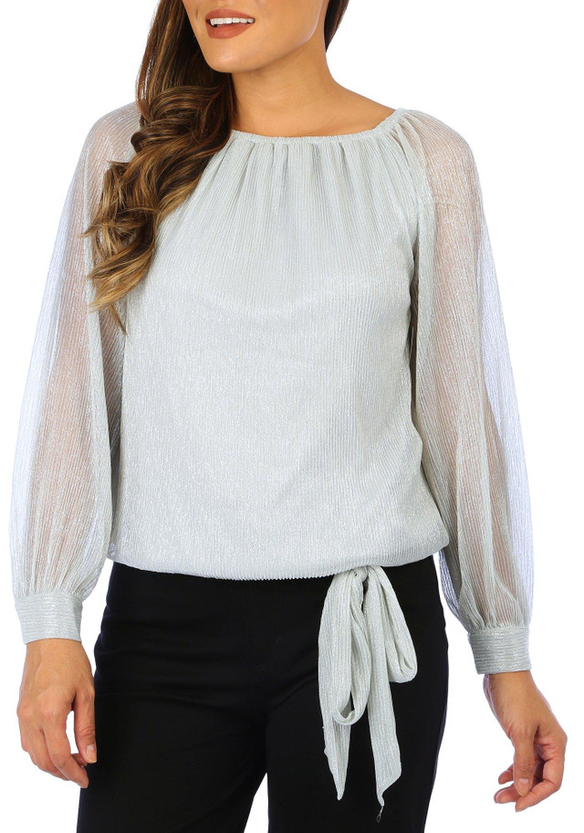 Elevate your style with our Petite Metallic Side Tie Blouse! This chic blouse features long sleeves and a round neckline, offering a classic yet elegant look. Made from 100% polyester, it provides a sleek and shimmering finish. The side tie detail adds a touch of sophistication and allows for a customizable fit. Perfect for both casual and dressy occasions, this blouse is a versatile addition to your wardrobe that will make you shine!