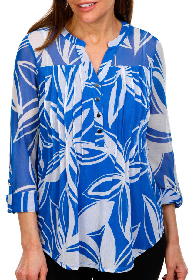 Discover the perfect blend of style and comfort with this bright 3/4 sleeve top! Adorned with a print design, this top is crafted from silky lightweight knit fabric, ensuring a luxurious feel. The V-neckline with a 4-button henley placket adds a touch of elegance, while the front pleat detail and roll tab sleeves offer a chic, versatile look. Front length is approximately 24 in. Fabrication is 95% polyester and 5% spandex.