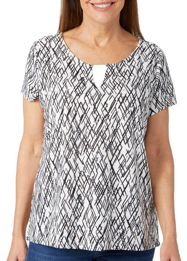 Enhance your wardrobe with this elegant Short Sleeve Top, crafted from brushed jacquard fabric for a luxurious and comfortable feel. The bar neck detail adds a modern and sophisticated touch, making this top perfect for both casual and dressy occasions. Pair it with tailored pants for a polished look or with jeans for a chic, everyday outfit. Fabrication is 95% polyester, 5% spandex.