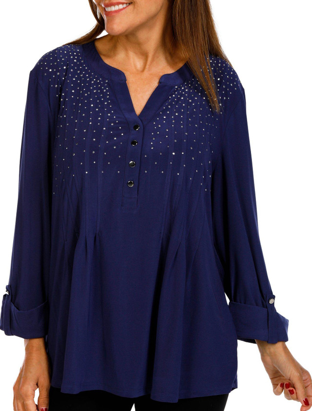 Elevate your casual wardrobe with our Henley 3/4-Sleeve Top. This stylish piece features embellished details that add a touch of sparkle, while the pleated details provide a flattering silhouette. The button-pinned cuffs offer a unique and sophisticated touch, making this top perfect for both casual and dressy occasions. Fabrication is 96% polyester, 6% spandex.
