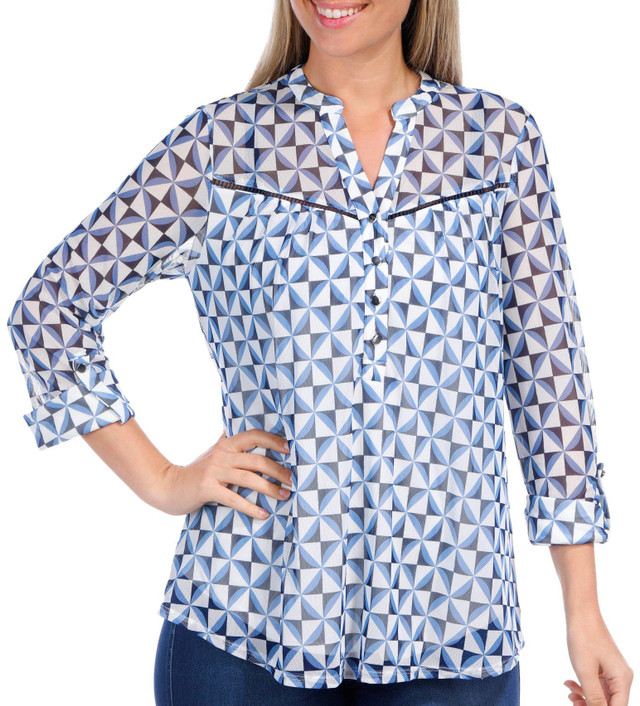This top features a stylish geometric print with a soft mesh outer layer. The pleated design and 3/4 length sleeves add a touch of elegance while the quarter button neckline offers a polished look. Made from a comfortable blend of polyester and spandex, this top is perfect for work or casual outings.