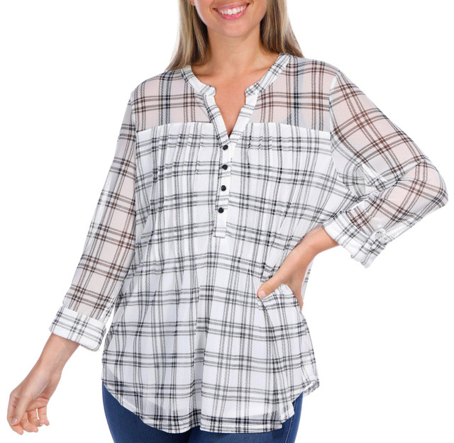 This plaid top features a classic print with a mesh exterior and pleated design. The quarter button down neckline and 3/4 sleeves add a polished touch. Made from a soft blend of polyester and spandex, it is a stylish and comfortable choice for work.