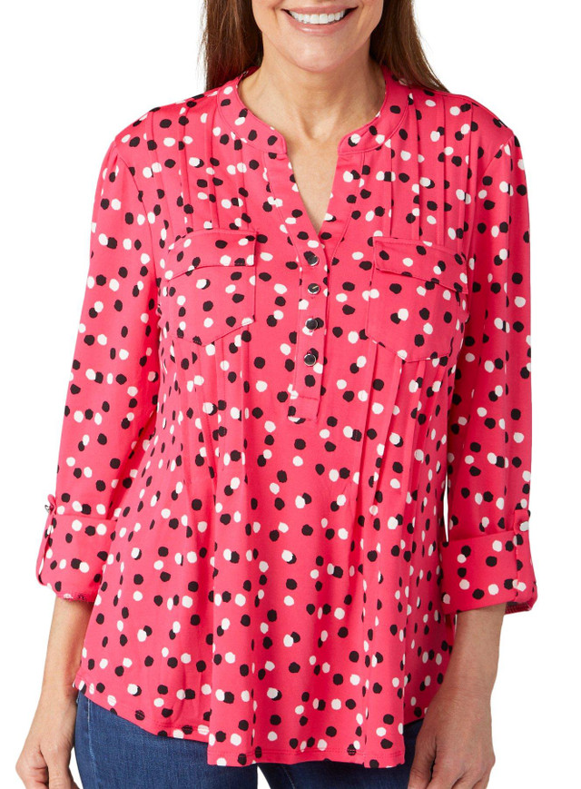 Add a touch of elegance to your wardrobe with this Print Pleated 3/4 Sleeve Top! Featuring roll-tab sleeves, pleated detailing, and two front chest pockets, this top is both stylish and functional. Made from 95% polyester and 5% spandex, it offers comfort and style, with a front length of approximately 25 inches.