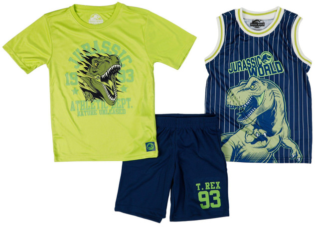 Unleash dino-sized style with this 3-piece T-Rex Shorts Set for little boys! Featuring a performance tee and basketball jersey, both with bold T-Rex graphics, plus comfy pull-on shorts, this set is perfect for active play and roaring adventures.