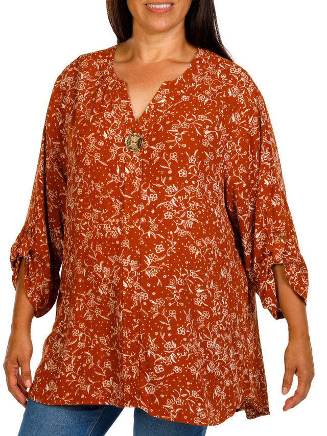 This plus size crepe top features a chic floral print with a split neckline and button accent. The lightweight fabric and three quarter sleeves make it a breezy and stylish choice for warm weather days. Fabrication 100% rayon