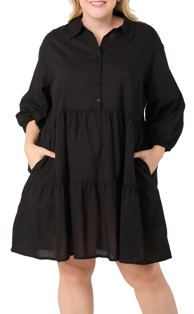 This Plus Cambric Tiered Dress features a stylish solid color, button-down collar, and 3/4 length sleeves for a polished yet relaxed look. Its tiered design adds movement and charm, making it a versatile piece for both casual and dressy occasions.