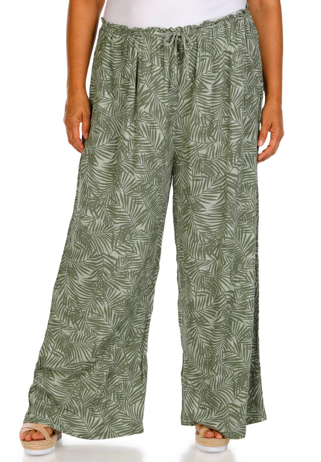 These plus size wide leg pants feature a stylish palm leaf print and a relaxed pull on fit with a drawstring waistband. Side seam pockets add function while the wide leg design offers breezy comfort and effortless style for any casual day. Fabrication 100% rayon