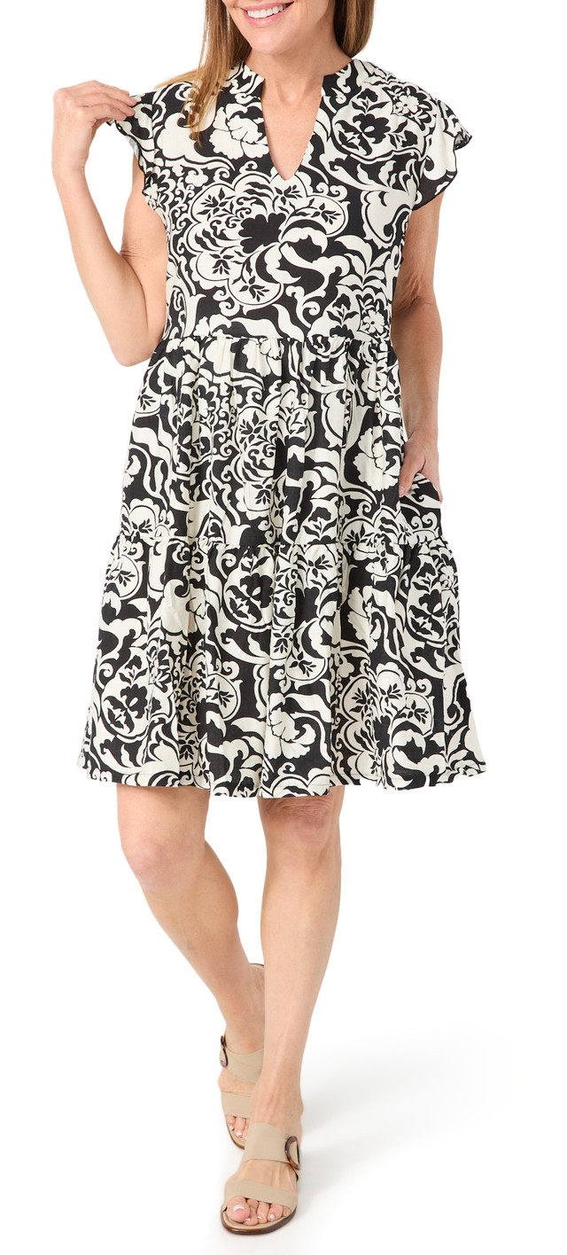 Bring effortless charm to your look with this womens flutter sleeve tiered dress featuring a stylish print, a split neckline, and soft flutter sleeves. The tiered design adds movement and a flattering silhouette, making it perfect for both casual days and dressier outings. Dress length measures approximately 36 inches. Fabrication 85% viscose, 15% nylon