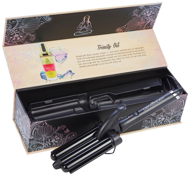 Create effortlessly beachy waves with this Triple Barrel Waver Curling Iron. Designed for all hair types, this styling tool features three tourmaline barrels that delivers infared heat for long-lasting, frizz-free waves in minutes. This waver also has a comfort grip handle and 360 degree swivel cord. Whether you're going for soft glam or bold texture, its quick heat-up and easy grip make styling a breeze.