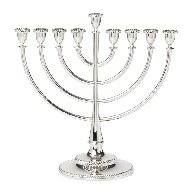 Add a touch of sophistication to your Hanukkah celebrations with this elegant silver menorah. Crafted from nickel-plated metal, it features a sleek, modern silhouette that shines beautifully in any setting. Perfect for decorative use, this menorah makes a timeless addition to your holiday decor. Dimensions: 11.8 in.L x 11 in.W x 12 in.H