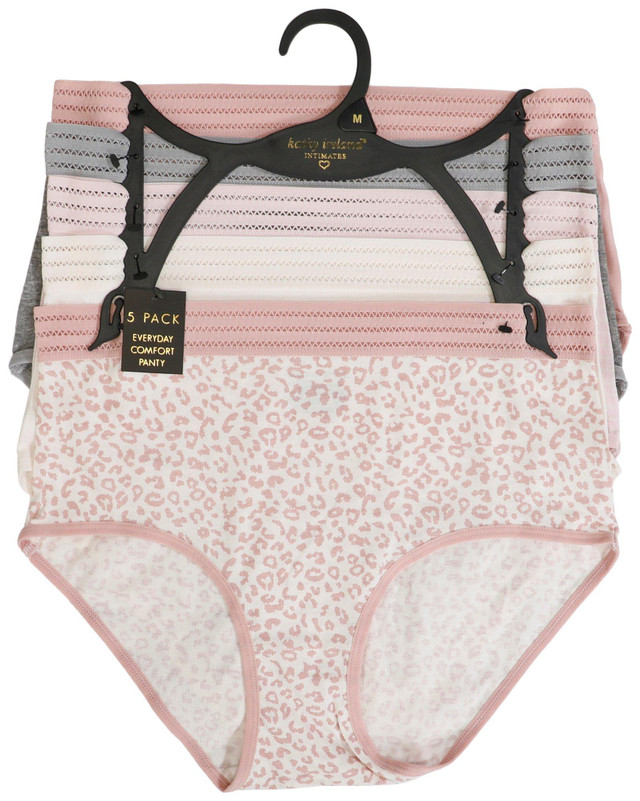 Enjoy breathable softness with the Womens 5 Pk Everyday Comfort Brief Panties. Featuring three solid colors, one stripe, and one animal print, each pair is designed for reliable comfort and a classic fit. Ideal for everyday wear under any outfit. Fabrication is 100% cotton.