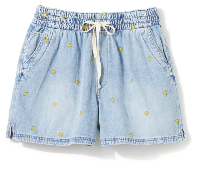 Stay cool and stylish in these womens denim shorts featuring a drawstring and elastic waist for easy comfort. Embroidered designs add a fun touch perfect for warm weather adventures. Great for beach days casual outings or laid back weekends. Fabrication is 85% cotton and 15% rayon.