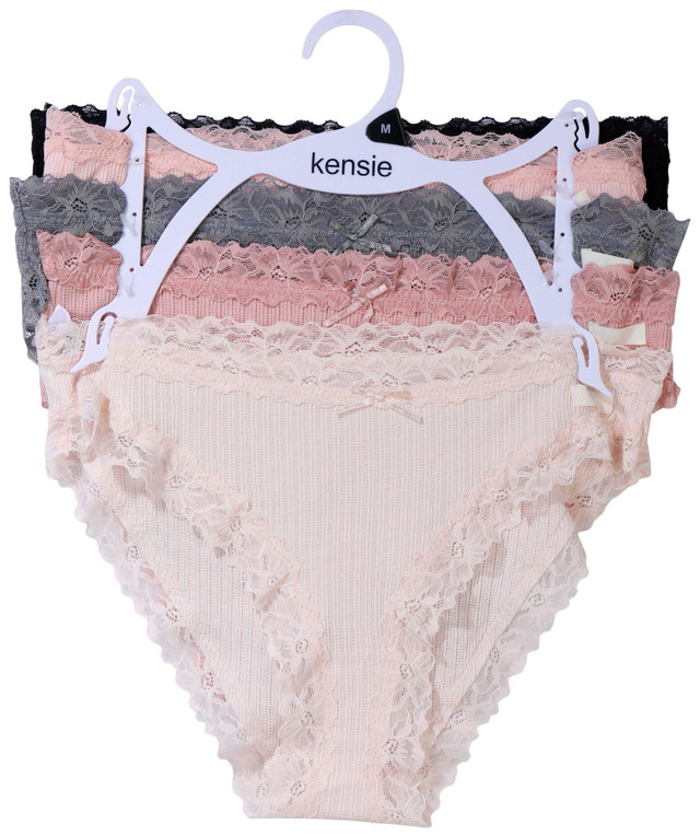 This 5 pack of bikini cut underwear from Kensie blends comfort and style with a ribbed texture and delicate lace detailing. Made from soft, stretchy fabric (85% nylon, 15% spandex), each pair offers a flattering fit and breathable feel. The assorted colors add a playful touch, while the full coverage design keeps you comfy from morning to nightperfect for everyday essentials moms love.