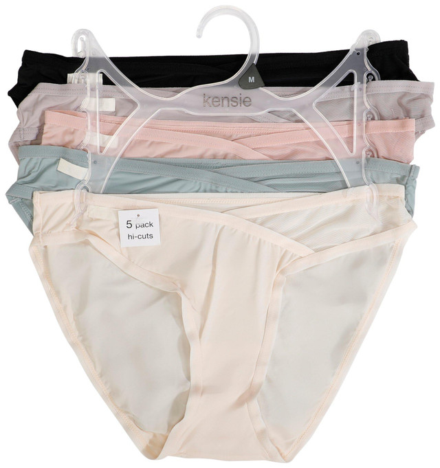 Enjoy sleek comfort with the Womens 5 Pk Microfiber Mesh Hi Cut Panties. Designed in a variety of solid colors, each pair offers a breathable fit with soft stretch and smooth coverage. Ideal for everyday wear under any outfit. Fabrication is 86% nylon, 14% spandex.
