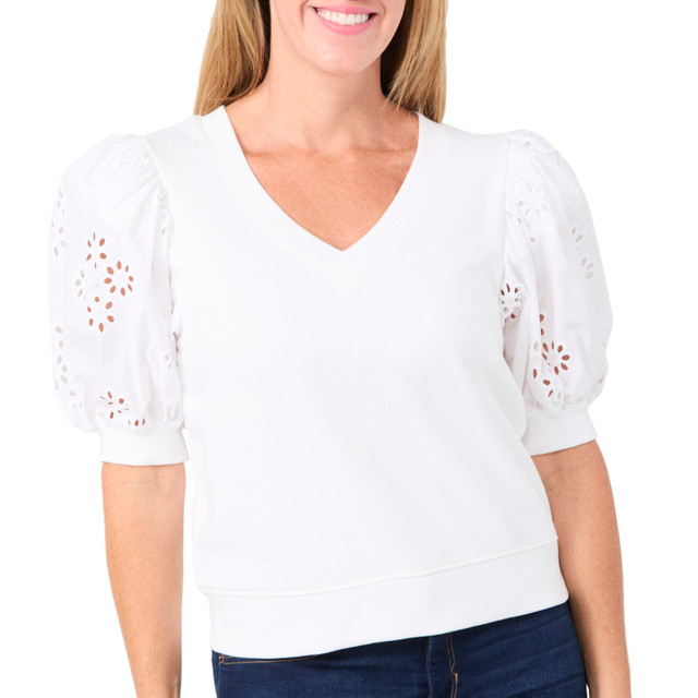 Effortlessly chic, this Womens Eyelet Puffer Sleeve V-Neck Top features a solid color design with short puff sleeves adorned in delicate eyelet cutouts. The flattering V-neckline adds a touch of elegance, making it perfect for both casual and dressy occasions. Fabrication is 60% cotton 40% polyester.