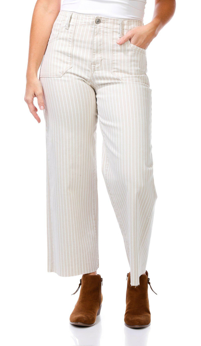 These womens ankle pants feature a wide leg and stripe design, crafted from cotton for comfort. Designed with patch pockets, button and fly closure, and frayed hems, they offer a stylish and casual look perfect for everyday wear. Inseam is approximately 27.5 in. Fabrication is 98% cotton and 2% spandex.