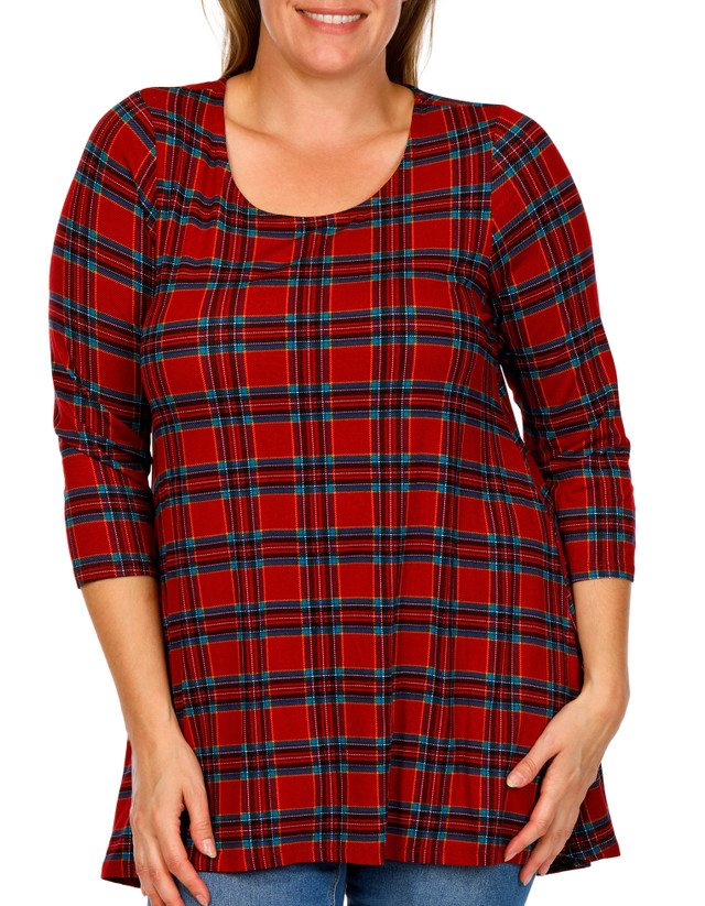 Add festive flair to your wardrobe with this plus-size plaid print legging tee. Featuring a fun holiday design, 3/4 sleeves, and a comfy fit perfect for pairing with leggings, it is a cheerful choice for seasonal lounging or casual outings. Fabrication is 95% rayon, 5% spandex