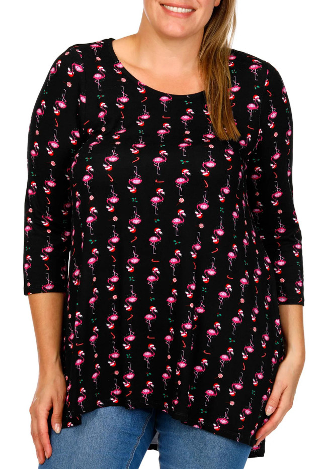 Add festive flair to your wardrobe with this plus-size Flamingo Christmas tree print legging tee. Featuring a fun holiday design, 3/4 sleeves, and a comfy fit perfect for pairing with leggings, it is a cheerful choice for seasonal lounging or casual outings. Fabrication is 95% rayon, 5% spandex